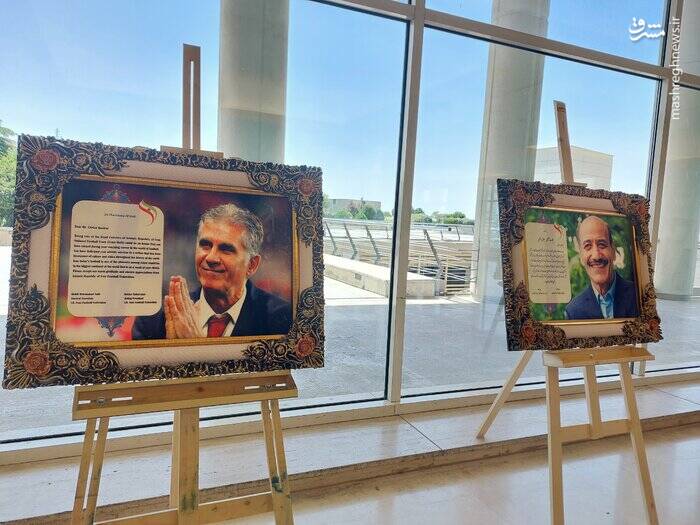 در محوطه لابی ورودی سالن اصلی همایشهای برج میلاد هم تابلو فرشهای با عکس پیشکسوتان فوتبال و سرمربیان تیمملی در دورههای مختلف به چشم میخورد.